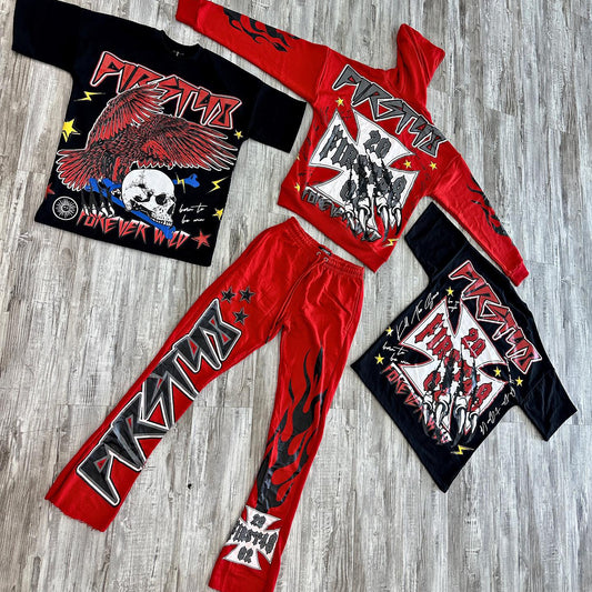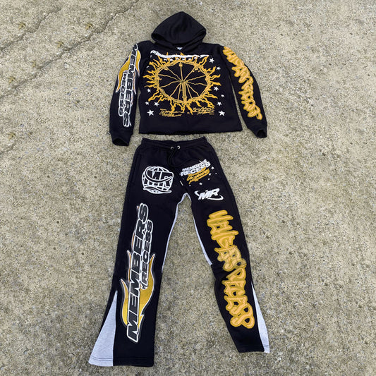 Flame patchwork retro washed street hoodie and trousers two-piece set