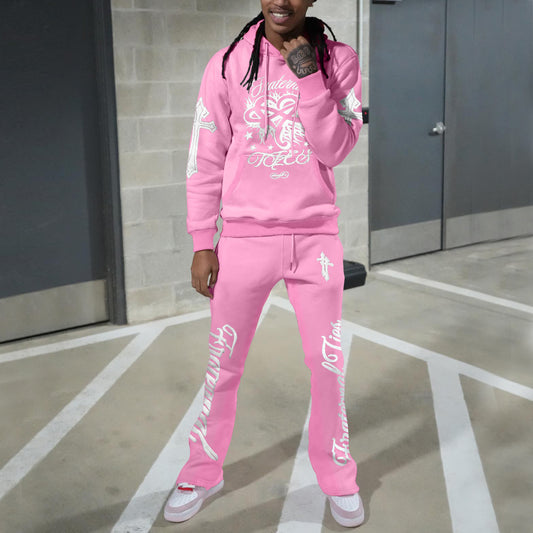 Pink love casual street patchwork trousers and hoodie pure cotton two-piece suit
