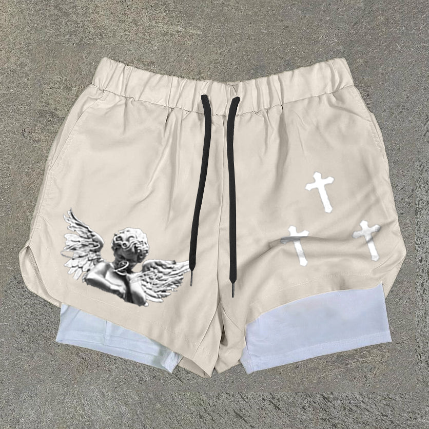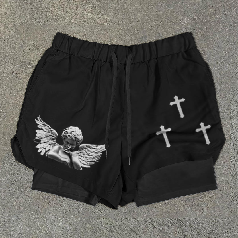 Angel & Cross Print Double Layer Quick Dry Shorts